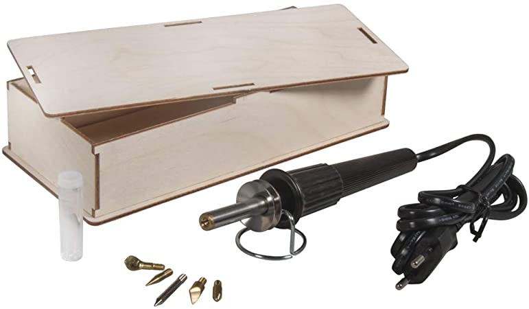 KIT PARA INICIARSE EN LA TÉCNICA DEL PIROGRABADO. INCLUYE PIRÓGRAFO O PIROGRABADOR TIPO SOLDADOR A 220-240 V, 5 PUNTAS DIFERENTES, MADERA PARA REALIZAR PRUEBAS DE 85X205 MM, CAJA DE ALMACENAMIENTO SUSCEPTIBLE DE PIROGRABARSE E INSTRUCCIONES DE TALLADAS. PARA REALIZAR TRABAJOS SOBRE MADERAS BLANDAS, GOMA EVA, CORCHO Y CUERO