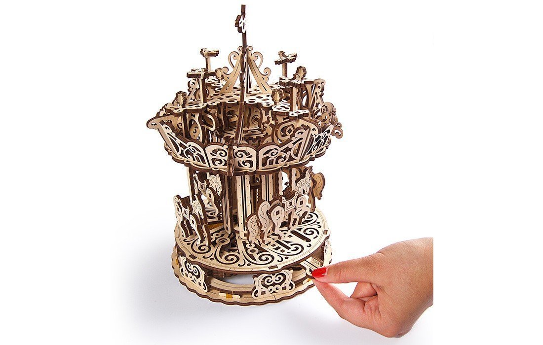 LA MAQUETA DEL CARRUSEL ESTÁ FABRICADA EN MADERA DE ALTA CALIDAD Y NO SE NECESITAN COLA NI HERRAMIENTAS ESPECIALES PARA SU MONTAJE. CUENTA CON INSTRUCCIONES DETALLADAS EN COLOR.