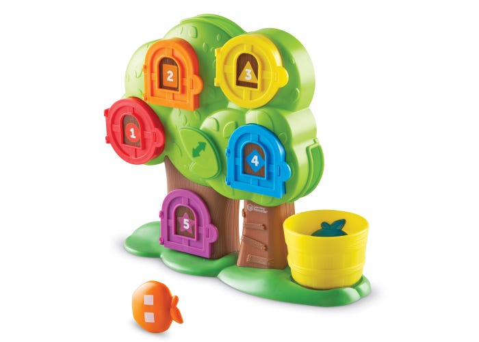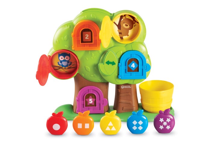 JUEGA AL ESCONDITE CON LAS CINCO PEGATINAS DE ANIMALES ESCONDIDOS DETRÁS DE CADA PUERTA NUMERADA O BIEN DESAFÍA A LOS NIÑOS A EMPAREJAR LAS MANZANAS CON LA PUERTA DE SU COLOR, NÚMERO O FORMA CORRESPONDIENTE. ADEMÁS DIVIÉRTETE CON LA RAMPA INCORPORADA QUE HARÁ QUE LAS MANZANAS CAIGAN A TRAVÉS DEL ÁRBOL Y SALGAN POR UNO DE LOS DOS AGUJEROS OCULTOS