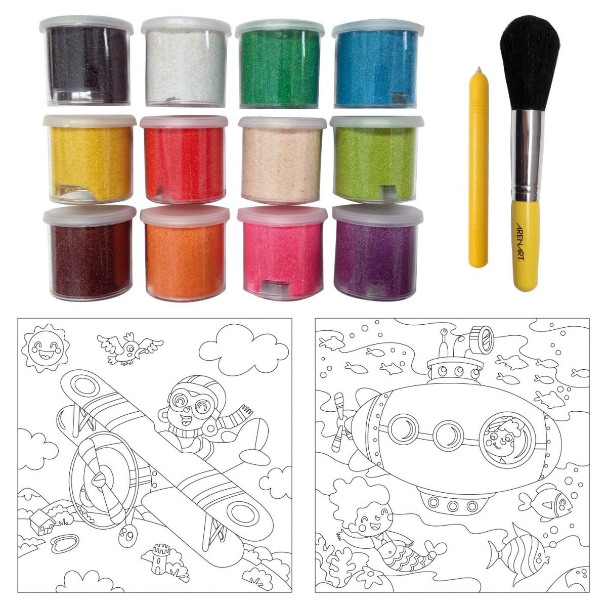 2 LÁMINAS PRECORTADAS PARA PINTAR CON ARENA. TAMAÑO: 30X30 CM. CONTIENE TODOS LOS COLORES DE ARENA NECESARIOS (BOTES DE 45 G), HERRAMIENTAS E INSTRUCCIONES. A PARTIR DE 6 AÑOS