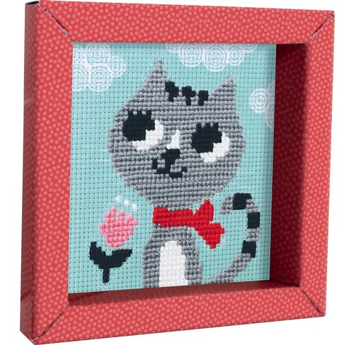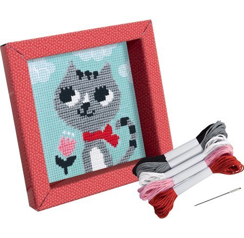 KIT PARA BORDAR UN CUADRO CON EL MOTIVO DE GATO. INCLUYE TELA DE 13X13 CM, HILOS, MARCO DE CARTÓN Y MODELO. EDAD RECOMENDADA: 6-10 AÑOS
