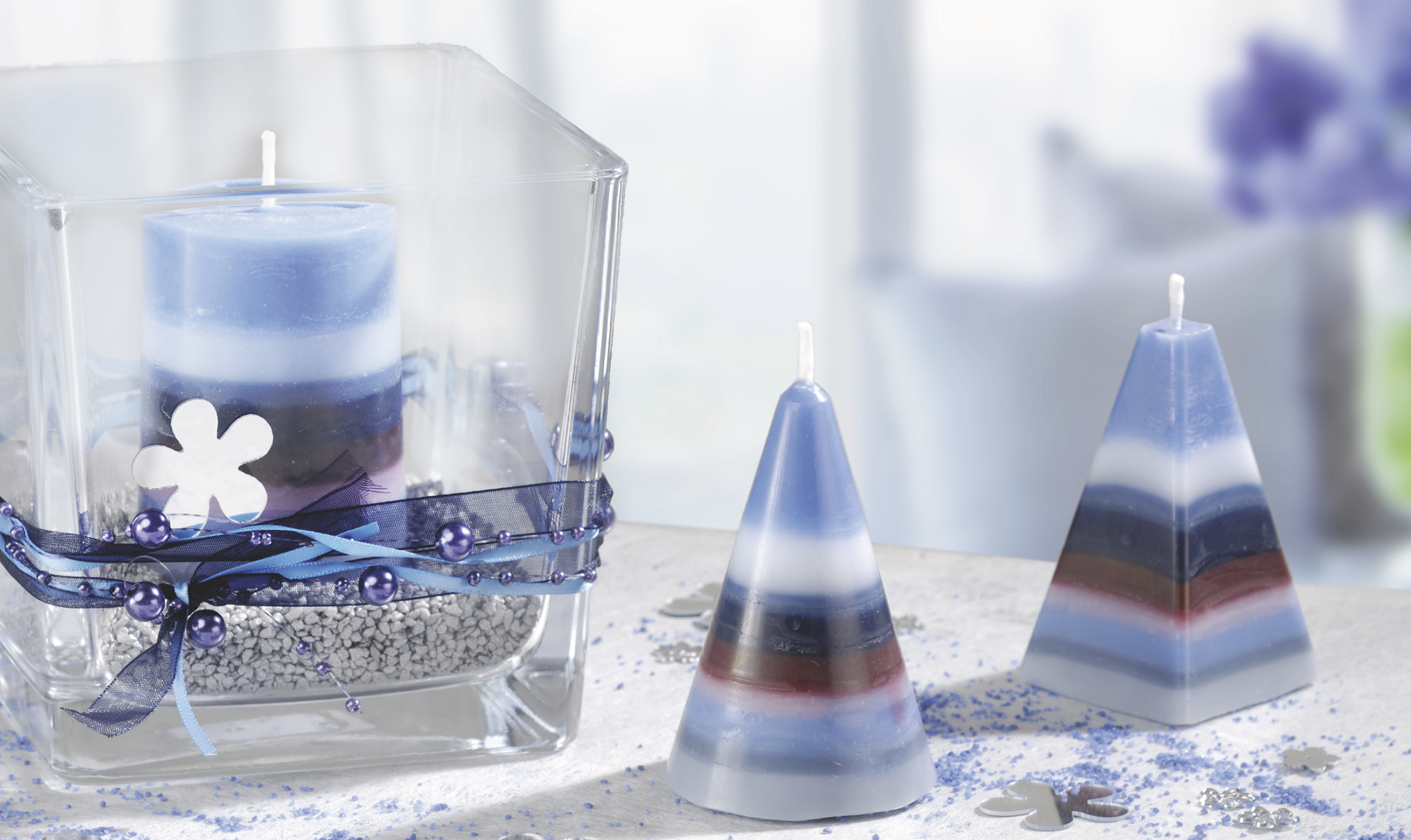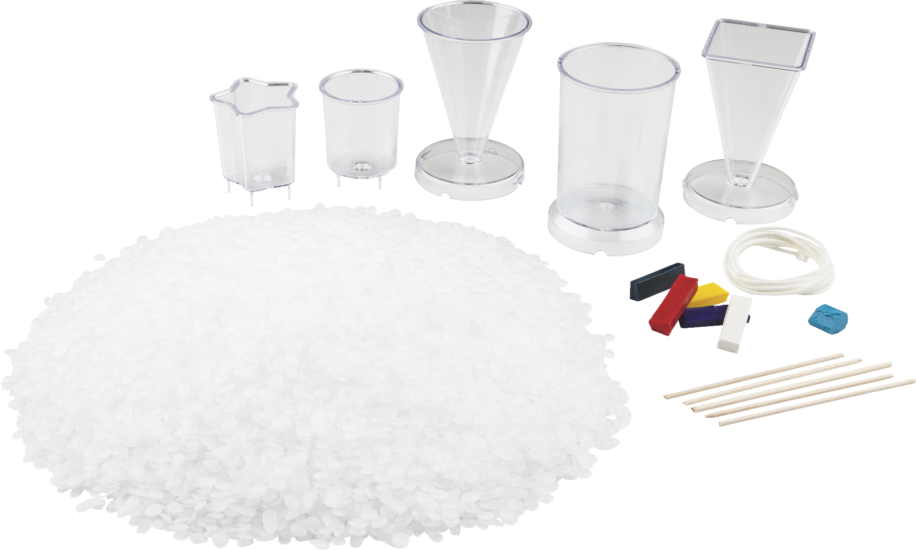 Conjunto temático para iniciarse en la creación y decoración de velas. Contiene: 3 moldes grandes, 500 gramos de parafina en escamas, 3 pigmentos de colores, masilla, 3 varitas de madera y 1 metro de mecha.