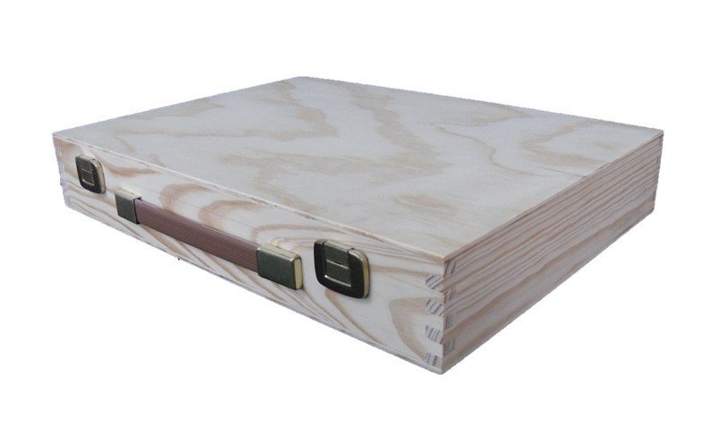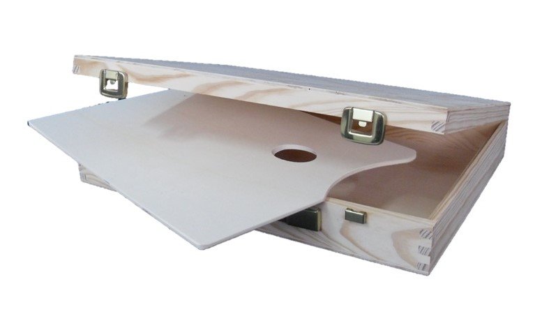 ESTUCHE DE MADERA NATURAL TIPO MALETÍN CON ASA DE IMITACIÓN DE CUERO Y CIERRES LATONADOS. CON PALETA Y SIN DIVISIONES. PARA GUARDAR Y TRANSPORTAR LOS ÚTILES DE LAS TÉCNICAS PICTÓRICAS, COMO AGUARRÁS, TUBOS DE PINTURA, PINCELES, TRAPO…